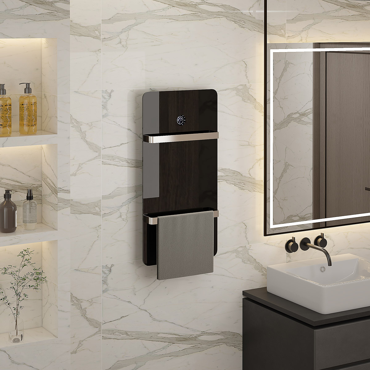 板式液顯多功能開關電熱毛巾架 Panel LCD display multifunction switch heated towel rail 材質Material:Glass 玻璃 功率Power:220V/140W 表面Surface:Black 黑色 尺寸Size:400*130*800mm 包裝Ctn size:440*150*860mm